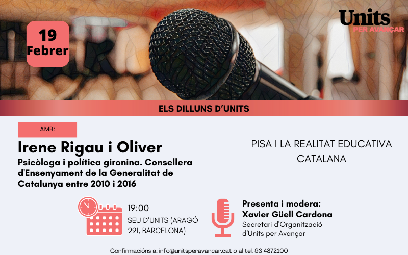 Us animem a assistir i a participar el pròxim dia 19 de febrer de 2024 a les 19.00 h. en la seu d’Units (C/Aragó, 291, de Barcelona) en una altra jornada dels Dilluns d’Units amb Irene Rigau, consellera d’Ensenyament de la Generalitat de Catalunya entre 2010 i 2016, sobre “Pisa i la realitat educativa catalana”.